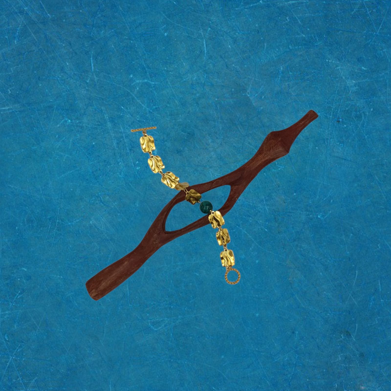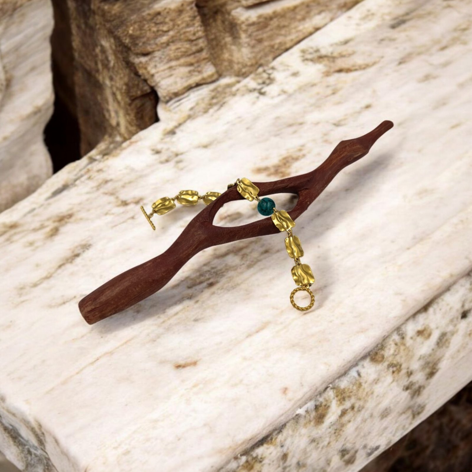 Μπρασελέ Ήφαιστος. Ένα χειροποίητο, μεγαλοπρεπές κόσμημα με ορυκτό απατίτη και ιδιαίτερο κούμπωμα. Το υλικό είναι ανοξείδωτο ατσάλι σε χρυσό σφυρήλατο χρώμα. Ανήκει στο σετ ” Ήφαιστος”. Για ξεχωριστές εμφανίσεις