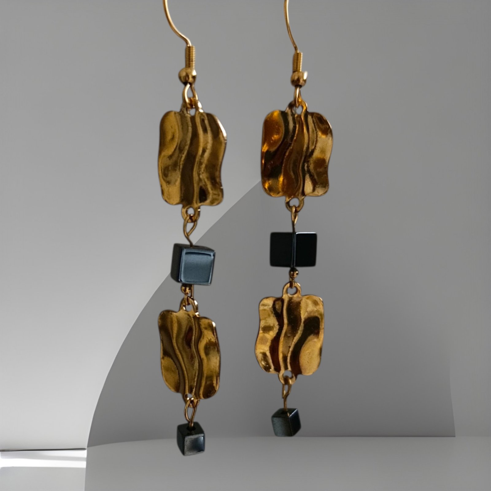 Σκουλαρίκια “Ήρα”. Χειροποίητα με σφυρήλατο stainless steel σε χρυσό χρώμα και λίθους ορυκτού κυβικού Αιματίτη. Μακρύ, εντυπωσιακό κόσμημα με υπέροχη, δυναμική κίνηση.